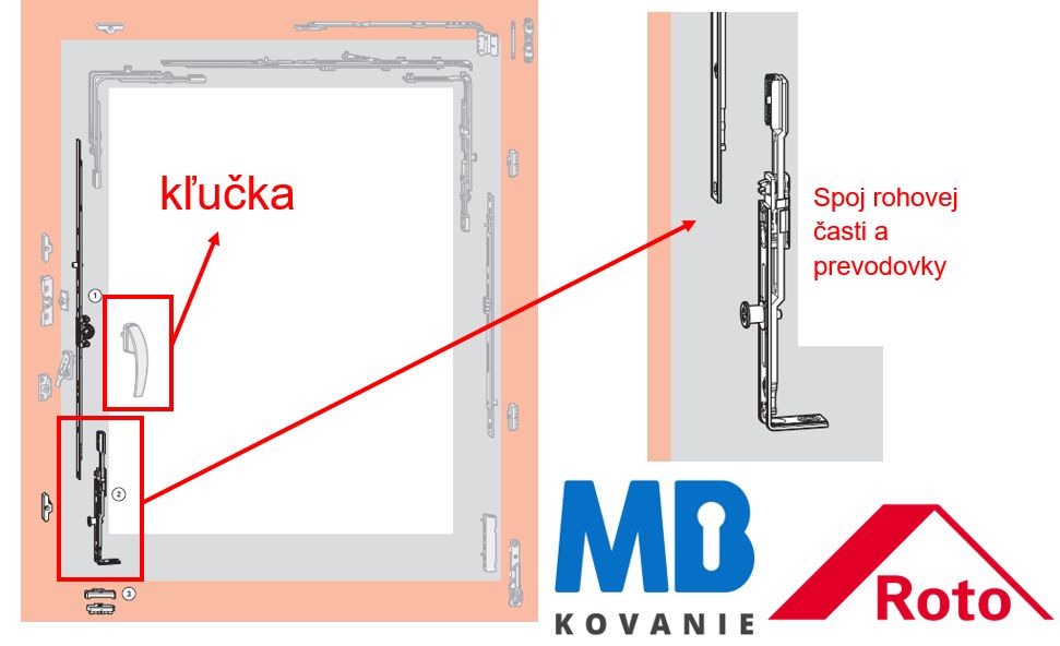 Pri kovaní Roto NT nájdete spoj rohovej časti (rohového vedenia) č. 260290 a prevodovky 259XXX priamo na rohu okna.